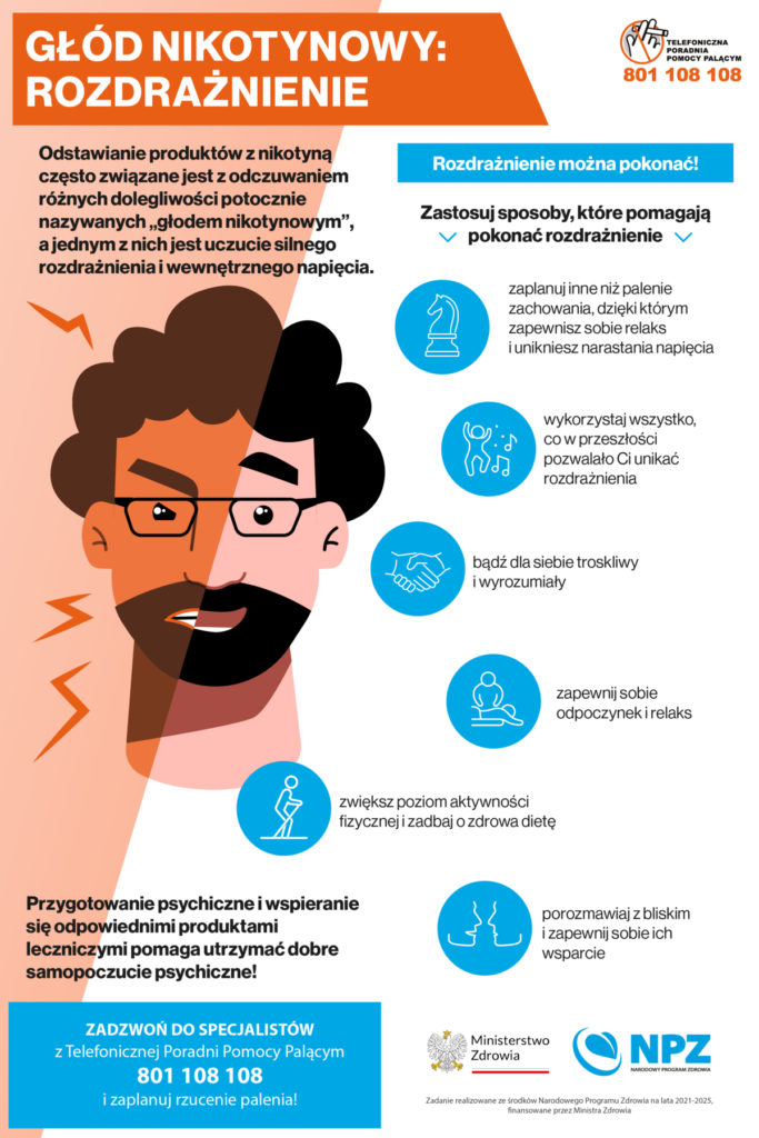 Biologiczne przyczyny drażliwości można wyraźnie zmniejszyć stosując środki farmakologiczne wspomagające proces rzucania palenia (https://jakrzucicpalenie.pl/tabletki-na-niepalenie/ ) lub łagodne środki uspakajające. Zawsze dobrze jest skonsultować się z lekarzem lub poradzić się specjalisty dzwoniąc do Telefonicznej Poradni Pomocy Palącym (801 108 108 lub 22 211 80 15).