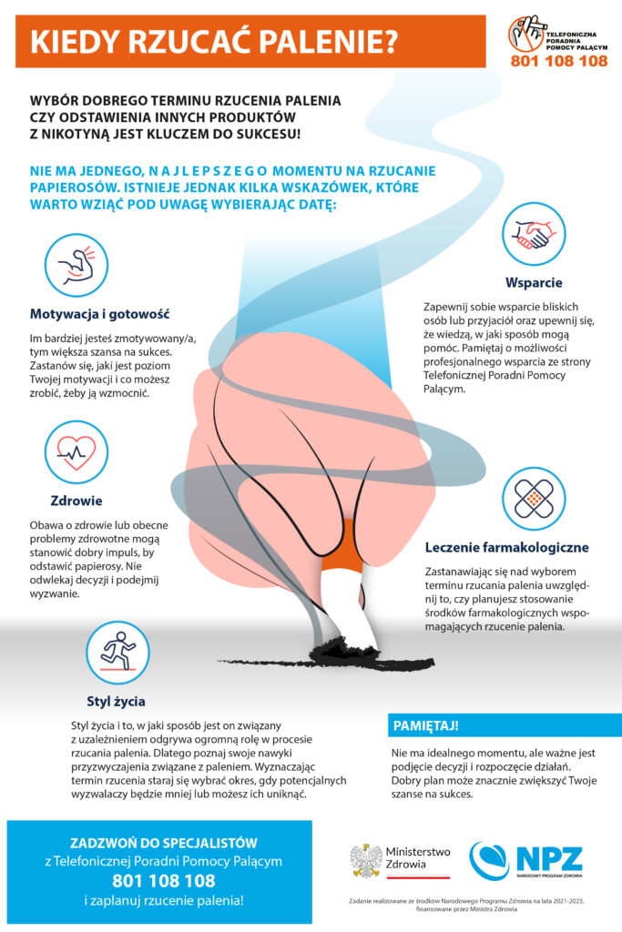 Pamiętaj, że nie ma idealnego momentu, ale ważne jest podjęcie decyzji i zaczęcie działać. Wsparcie i planowanie mogą znacznie zwiększyć Twoje szanse na sukces. Zadzwoń do Telefonicznej Poradni Pomocy Palącym i opracuj swój plan rzucenia palenia: 801 108 108 lub 22 211 80 15.