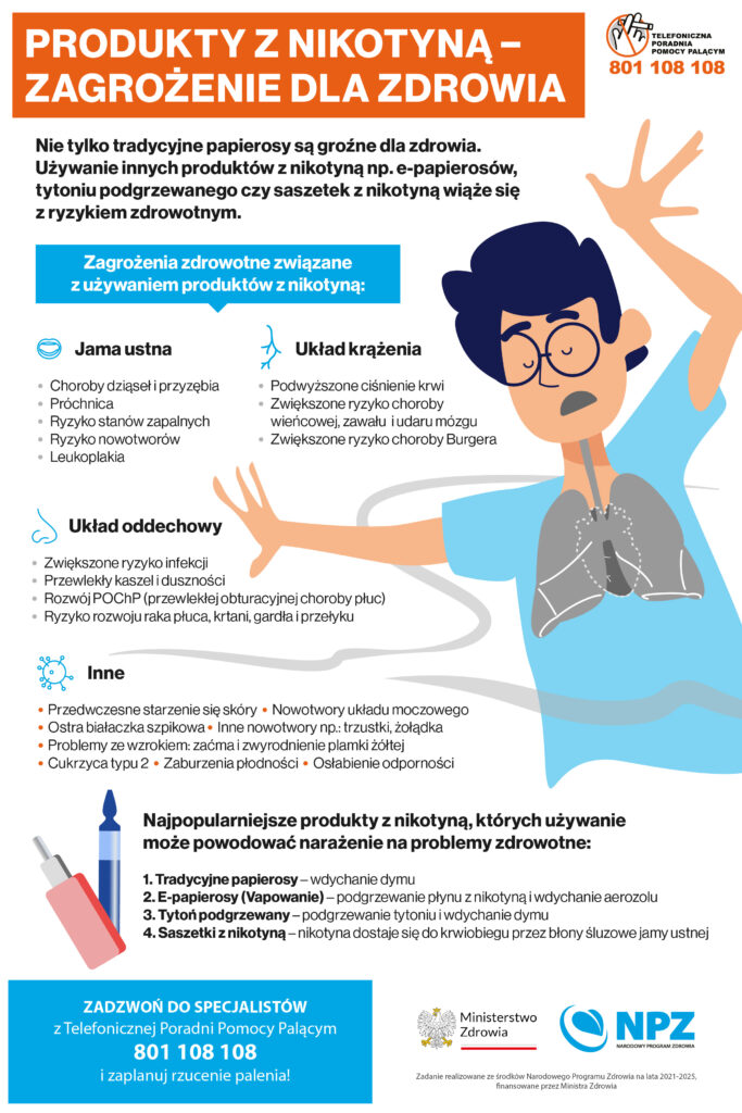 Jeśli chcesz dowiedzieć się więcej albo potrzebujesz wsparcia w rzuceniu palenia lub innych produktów nikotynowych, skontaktuj się z Telefoniczną Poradnią Pomocy Palącym. Konsultanci są dostępni pod numerem 801 108 108 (z telefonów stacjonarnych) lub 22 211 80 15 (z telefonów komórkowych). Pomoc jest bezpłatna, profesjonalna i dostępna dla każdego.
