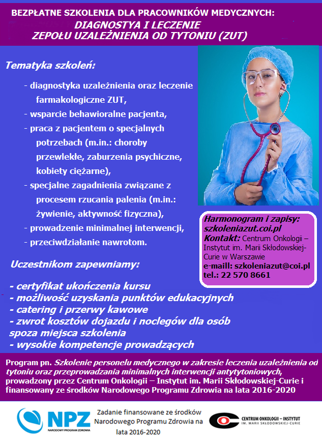Zapraszamy do udziału w nieodpłatnych szkoleniach  z zakresu diagnostyki i leczenia zespołu uzależnienia od tytoniu (ZUT)