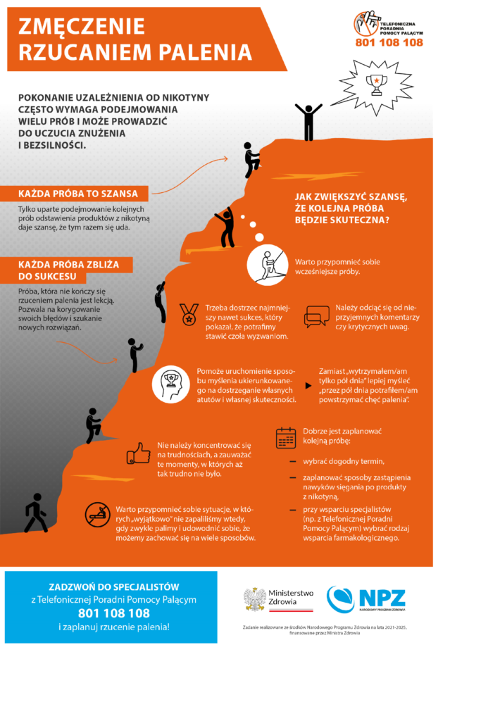 - Dobrze jest w ramach przygotowania do rzucenia palenia dobrze zaplanować kolejną próbę: wybrać dogodny termin, zaplanować sposoby zastąpienia nawyków sięgania po produkty z nikotyną, przy wsparciu specjalistów (np. z Telefonicznej Poradni Pomocy Palącym) wybrać rodzaj wsparcia farmakologicznego.
